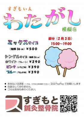 我孫子観音祭り期間中は休診となりますが、地域行事参加活動として弊院軒先にて綿菓子店を開きます。