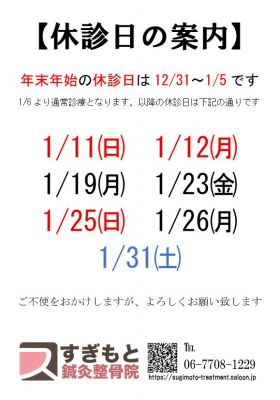 年末年始の休診は12/29~01/04とさせていただき、新年は01/05㈬から通常診療となります。